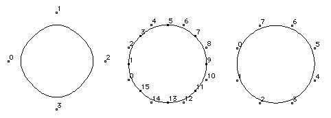 FIGURE 13, "Three circles too few(left), too many(middle), just right (right)." shows three different attempts to define a circle. In the leftmost example, four off-curve points are used but are insufficient to produce a round shape. The rightmost example uses 8 off-curve points which results in a circular curve that can be made a perfect circle with the exception of an arbitrarily small error factor. The middle example, also produces an accurate circular shape but uses more points than are necessary. In particular the on-curve points, located at the midpoints of the tangents to the curve, add no extra information and might have been omitted.