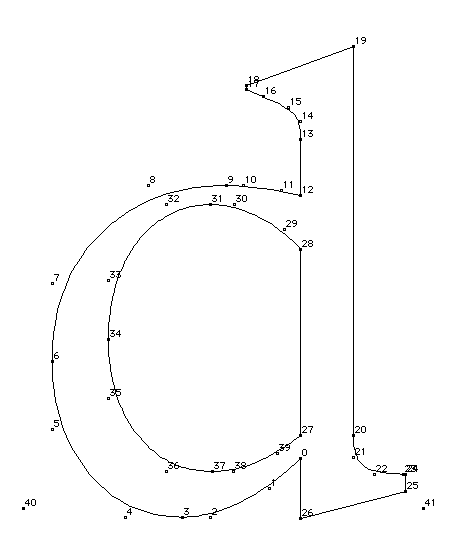FIGURE 7 demonstrates the use of winding numbers in determining whether a point is inside a glyph. Considering each of the points in questions, the following can be said: