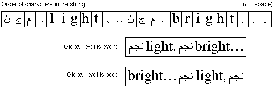 Remember that this ordering within a string reflects raw, simple character codes in phonetic order. In particular, Arabic strings are not presented to an AAT text processor in already reversed order. For instance, in a string of mixed Arabic and English like the one shown in the following figure, the characters appear left to right in the order in which they should appear on the page for the native speaker of that language. Fortunately, all of this bidirectional ordering is handled by ATSUI using the Unicode bidirectional algorithm, so ATSUI clients need not worry themselves about doing bidirectional reordering.