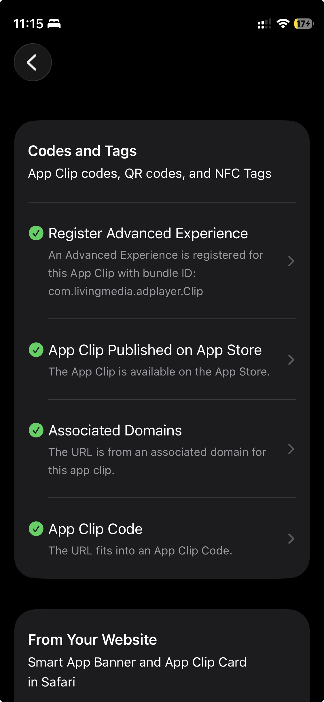 •	App Clip Bundle ID: com.livingmedia.adplayer.Clip