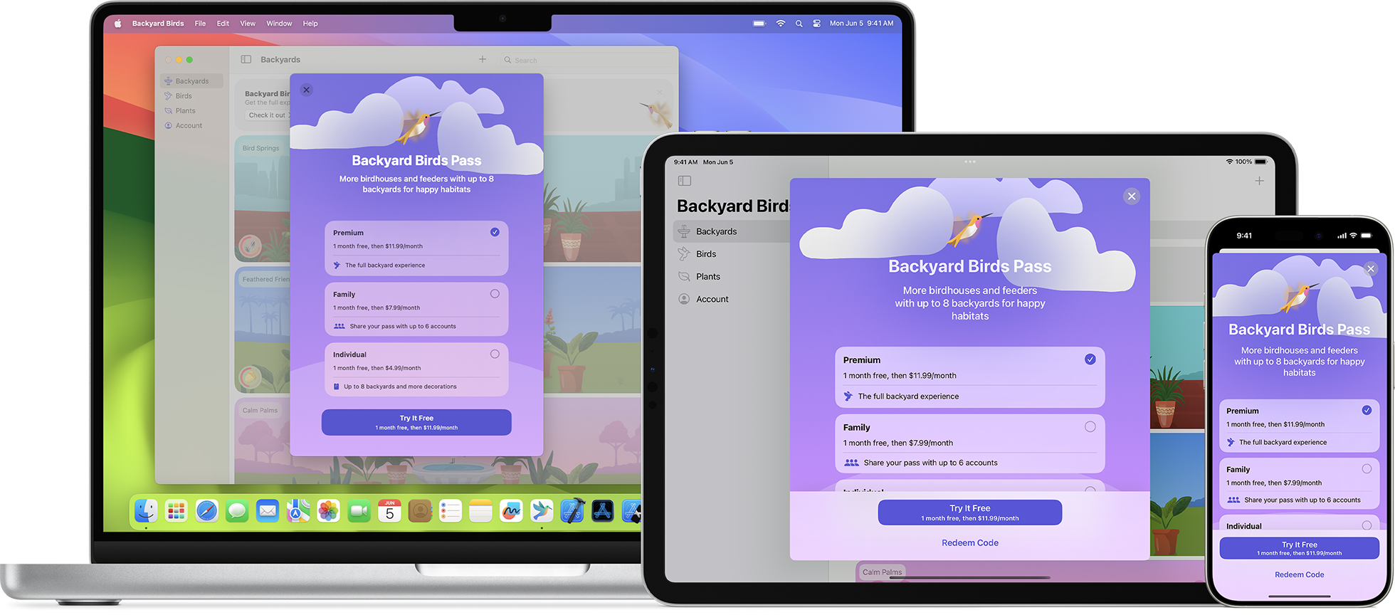 It’s easy to build intuitive payment experiences for In-App Purchases and subscriptions using StoreKit views. With as little as one line of code, StoreKit views clearly present the description, price, and duration for each level of service. And with built-in localization support, In-App Purchase details are displayed in the relevant language and currency, without any extra development work. You can also customize StoreKit views to match the look and feel of your app.
