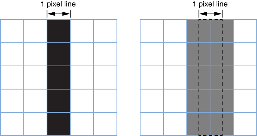 In iOS, when you draw things onscreen, the graphics subsystem uses a technique called antialiasing to approximate a higher-resolution image on a lower-resolution screen. The best way to explain this technique is by example. When you draw a black vertical line on a solid white background, if that line falls exactly on a pixel, it appears as a series of black pixels in a field of white. If it appears exactly between two pixels, however, it appears as two grey pixels side-by-side, as shown in Figure 1-3.