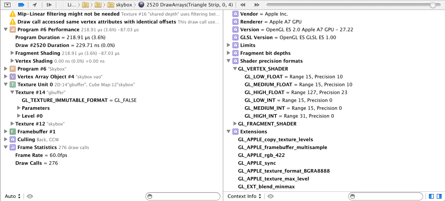 The Context Info view, shown on the right in Figure B-14, lists static information about the OpenGL ES renderer in use: name, version, capabilities, extensions and similar data. You can look through this data instead of writing your own code to query renderer attributes such as GL_MAX_TEXTURE_IMAGE_UNITS and GL_EXTENSIONS.