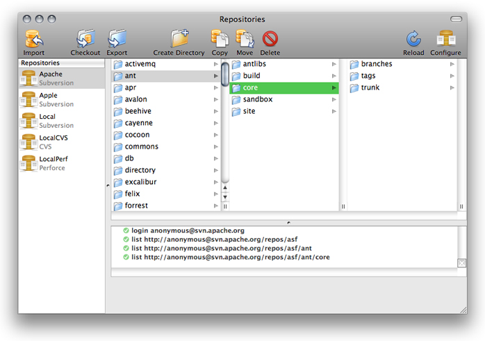 The Repositories window, described in The Repositories Window, allows you to navigate the repositories that your repository configurations reference. You can also perform repository management operations, such as importing and exporting projects, creating and deleting directories, and copying, renaming, and moving directories. (Because not all of the supported source control systems provide programming interfaces for each of these operations, some of them may not be executable through the Xcode user interface.)