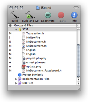 • The project file. The project file, which Xcode maintains in the project package with the name project.xcodeproj, stores project-related information, such as the files that are part of the project, the groups in the Groups & Files list, build settings, target definitions. Xcode constantly writes out this file; therefore, most of the time its status is M (for details on file status codes, see Viewing File Status).