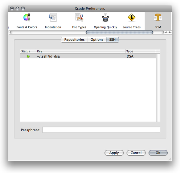To have Xcode ask you for a passphrase when it needs to use a particular SSH key, enter the passphrase in the Passphrase text field.