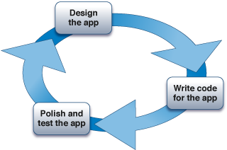 Figure 4-1 shows a typical organization of the development process. You design what you want your app to do and how it should work, implement those ideas in code, and then test the code you’ve written.
