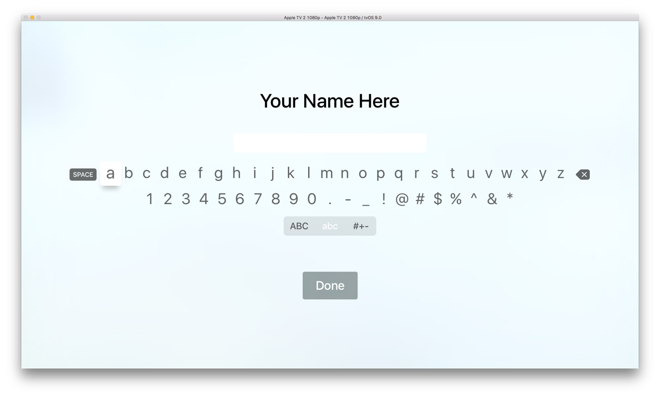 To change focus or to take other scroll-like actions with the simulated remote, hold down the Option key as you move the mouse pointer over the touch surface. Both the direction and speed of motion can impact the resulting behavior. For example, when using the simulated remote with the tvOS text entry screen shown in Figure 4-3, moving the mouse pointer in a slow, small downward motion from the top of the simulated touch surface moves the focus from the a key to the 1 key. Moving quickly from the top to the bottom of the simulated touch surface shifts the focus to the Done button.