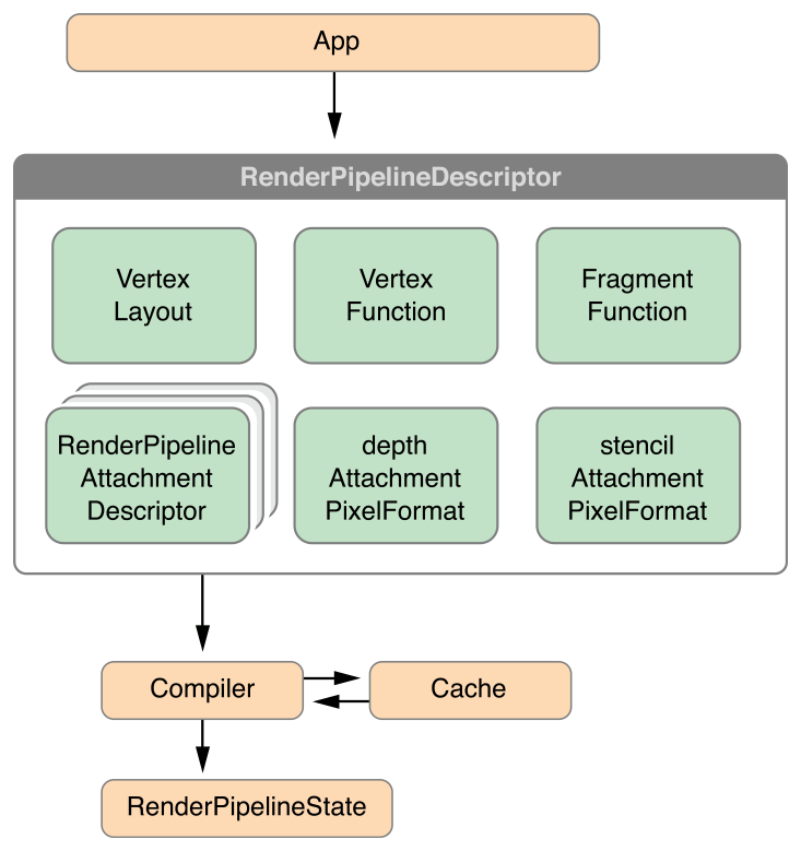 To create a render pipeline state, first create a MTLRenderPipelineDescriptor object, which has properties that describe the graphics rendering pipeline state you want to use during the rendering pass, as depicted in Figure 5-2. The colorAttachments property of the new MTLRenderPipelineDescriptor object contains an array of MTLRenderPipelineColorAttachmentDescriptor objects, and each descriptor represents a color attachment state that specifies the blend operations and factors for that attachment, as detailed in Configuring Blending in a Render Pipeline Attachment Descriptor. The attachment descriptor also specifies the pixel format of the attachment, which must match the pixel format for the texture of the render pipeline descriptor with the corresponding attachment index, or an error occurs.