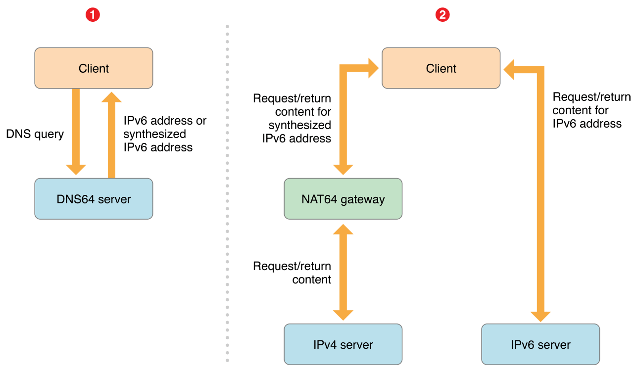Ideally, providers want to drop support for the IPv4 network. However, doing so prevents clients from accessing IPv4 servers, which represent a significant portion of the Internet. To solve this problem, most major network providers are implementing a DNS64/NAT64 transitional workflow. This is an IPv6-only network that continues to provide access to IPv4 content through translation.