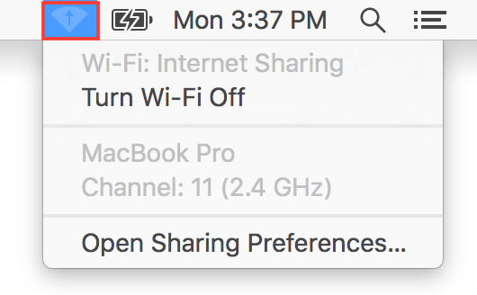 Once sharing is active, you should see a green status light and a label that says Internet Sharing: On. In the Wi-Fi menu, you will also see a small, faint arrow pointing up, indicating that Internet Sharing is enabled. You now have an IPv6 NAT64 network and can connect to it from other devices in order to test your app.