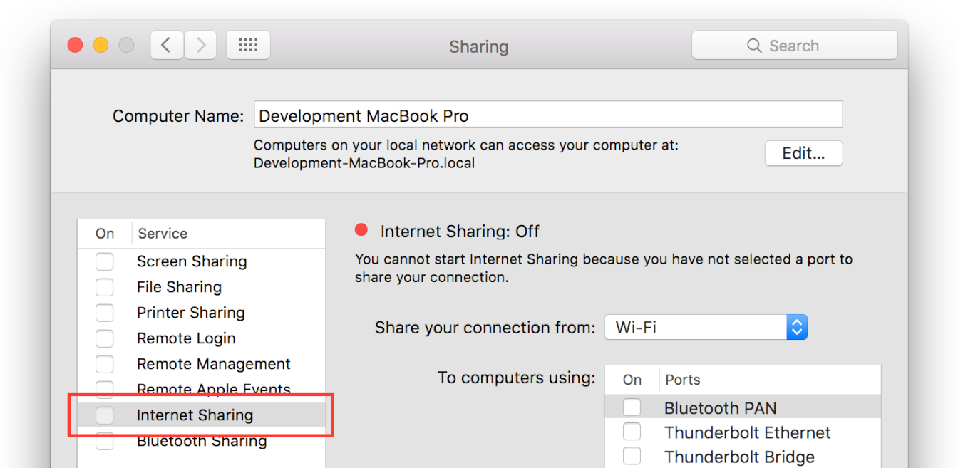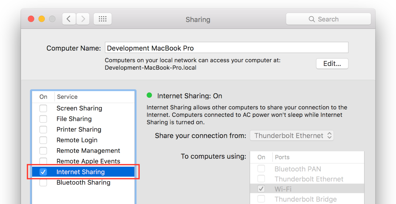 7. Choose the network interface that provides your Internet connection, such as Thunderbolt Ethernet.