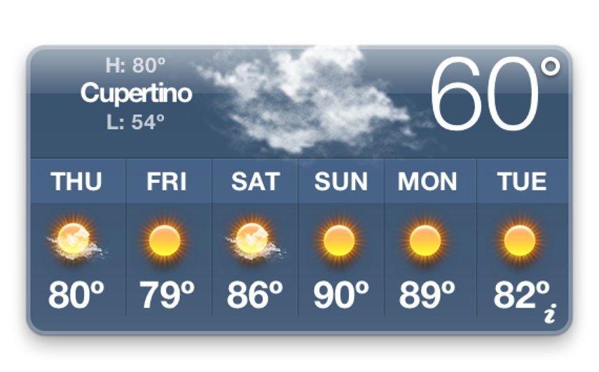 A widget is a mini application that exists exclusively in Dashboard. From the user’s perspective, it behaves as an application should: it shows useful information or helps them perform a simple task with a minimum of input. For example, Weather (shown in Figure 2) displays a 6 day weather forecast for the location the user selects.
