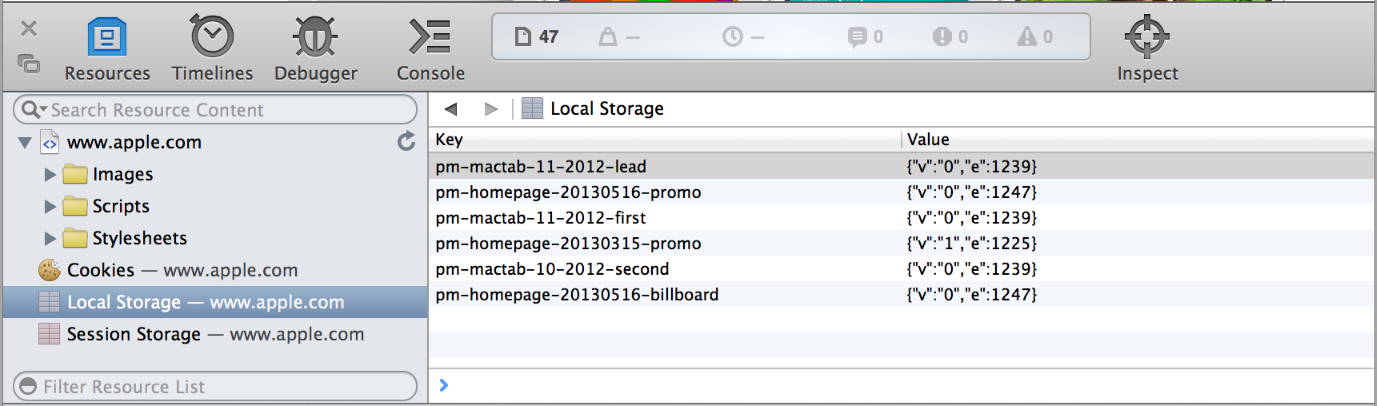 If your web app uses HTML5 Web Storage, keys and values you set in your code appear in the Local Storage offline resource, as shown in Figure 2-11. Local storage is displayed as an editable data grid of key-value pairs. Double-click an empty row to create a new entry, and double-click an existing entry to edit its value. Pressing the Delete key on a selected entry removes the key-value pair. Local storage provides a database of up to 5 MB per domain that persists even after Safari is quit.