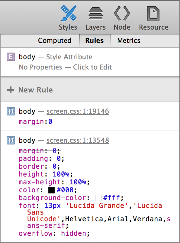 The Rules tab lists CSS rules that pertain to the selected element. The rules are collected from inline styles, attached stylesheets, and User Agent stylesheets. User Agent stylesheets are styles that Safari itself applies, such as a default margin.