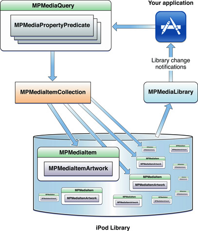 The second scenario in Figure 4-1 is your application receiving change notifications from the iPod library by way of the MPMediaLibrary class. By registering to receive these change notifications, your application can update any cache of library content if a user syncs their device while your application is running.
