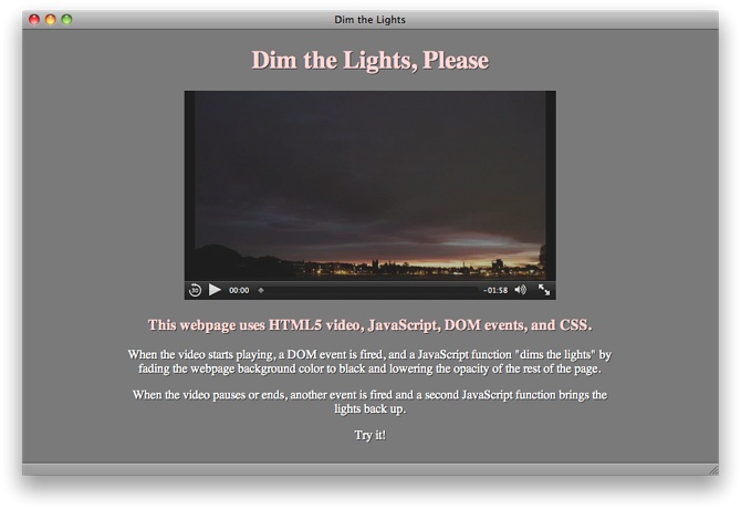 The example listens for the playing, pause, and ended events. When the playing event fires, a function stores the current background color, sets the background color to black, and sets the opacity of the rest of the page to 0.25. When the pause or ended event fires, a second function restores the background color and sets the opacity to 1.