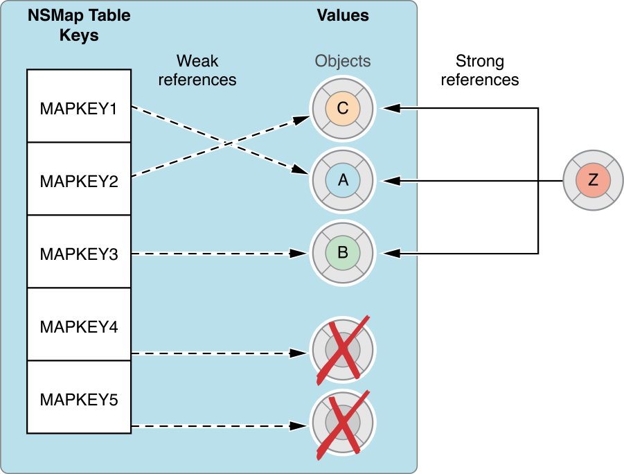 You can use an NSMapTable object when you want a collection of key-value pairs that uses weak references. For example, suppose you have a global map table that contains some objects. Because global objects are never collected, none of its contents can be deallocated unless they are held weakly. Map tables configured to hold objects weakly do not own their contents. If there are no strong references to objects within such a map table, those objects are deallocated. For example, the map table in Figure 2 holds weak references to its contents. Object D and Object E will be deallocated, but the rest of the objects remain.