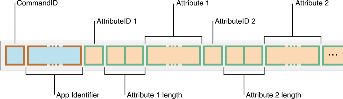 AttributeList: A list of AttributeIDs/16-bit Length/Attribute tuples. An attribute is always a string whose length in bytes is provided in the tuple but that is not NULL-terminated. If a requested attribute is empty or missing for the app, its length is set to