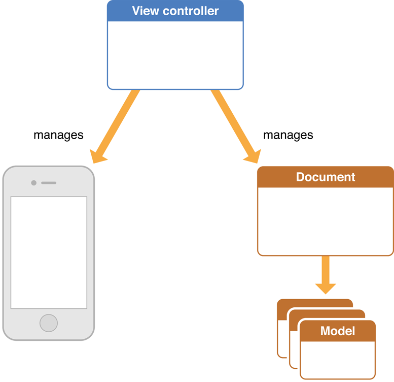 In MVC terms, a document is a model controller; it “owns” and manages the model objects that represent the document’s content. The document object itself is owned and managed by a view controller. The view controller, by definition, also manages a view that presents the content managed by the document object. It is thus a mediating controller in this network of relationships, obtaining the data it needs to present in the view from the document object and passing data entered or changed by users to the document object. Figure 1-2 depicts these object relationships.