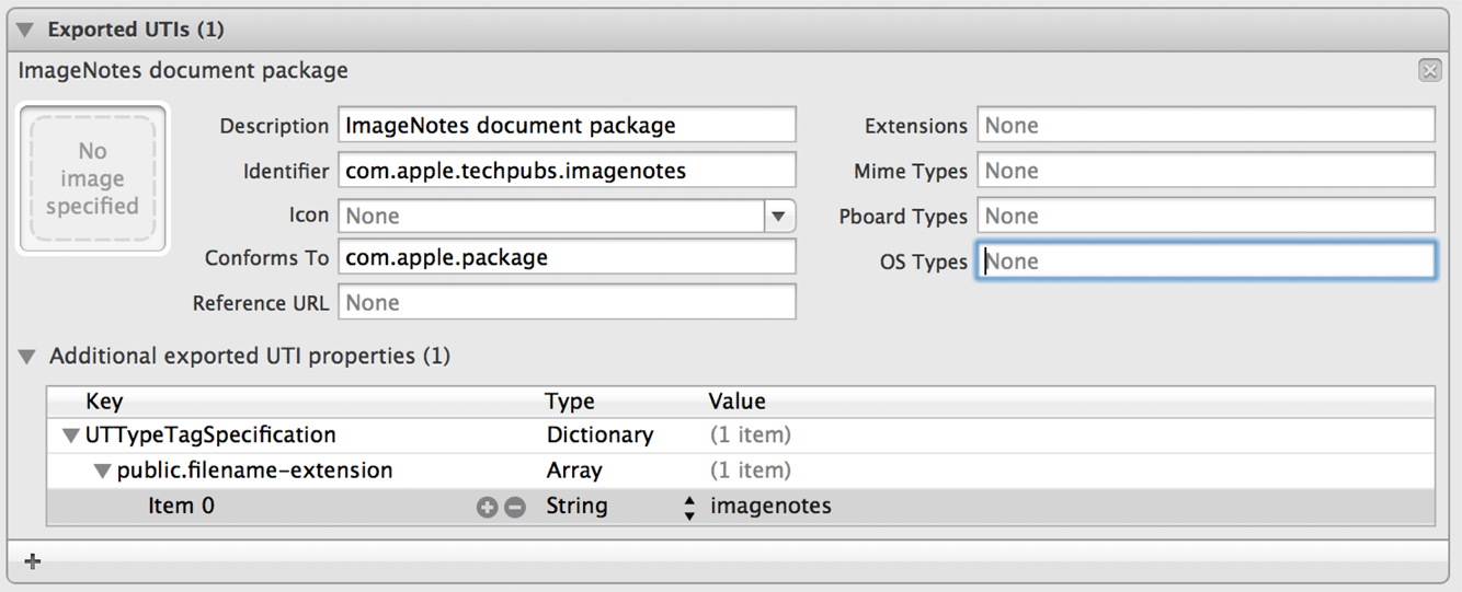 If you define a custom UTI for your documents, you must also export it. To export a document type in Xcode, start by clicking the Add button in the target’s Info settings and choose Add Exported UTI from the pop-up menu. Click the triangle next to Untitled to disclose the property fields and add the properties in Table 2-2.