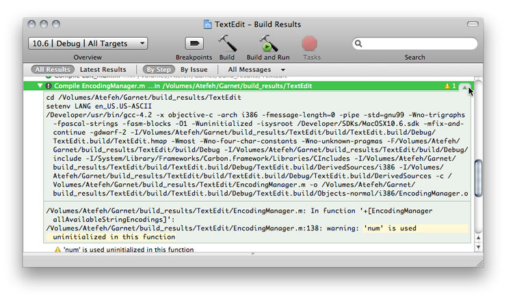 • All Results button. Displays the results generated since the last clean was performed. Xcode remembers the results of multiple builds, which allows you to gauge your progress solving issues across several builds.