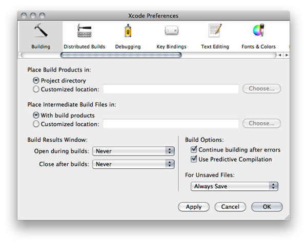 Each time you create a project, Xcode sets the build locations for that project to the default build locations specified in the Building pane of Xcode preferences. You can, however, override these default build locations on a per-project basis. By taking advantage of this feature, you can choose default build locations that works best for most of your projects, and specify other default build locations for individual projects as needed.