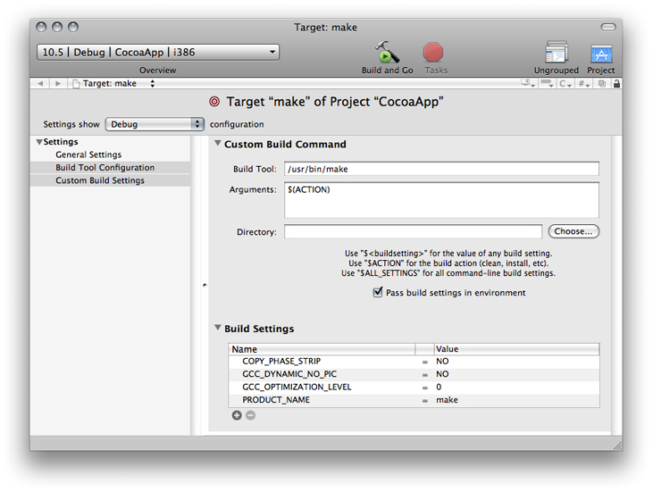To view the build settings for an external target, select the Custom Build Settings group. To view the build settings for a legacy Project Builder target, select the Custom Build Settings item in the Settings group. The target editor displays a table of build settings: