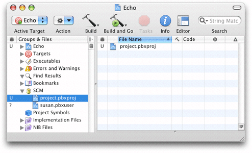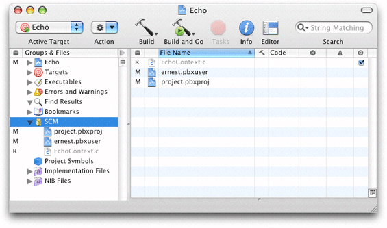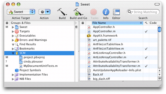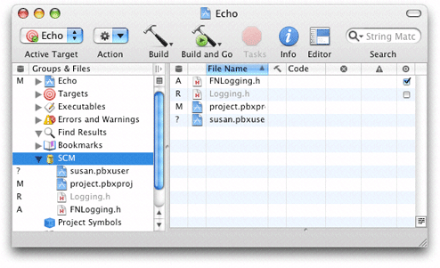 Xcode’s detail view lists all the files in a project. When using version control, you can add the SCM column to the detail view by selecting the project group in the Groups & Files list and choosing View > Detail View Columns > SCM. The SCM column shows the status of each file in the project. Figure 22-2 shows the SCM column in Xcode’s detail view.