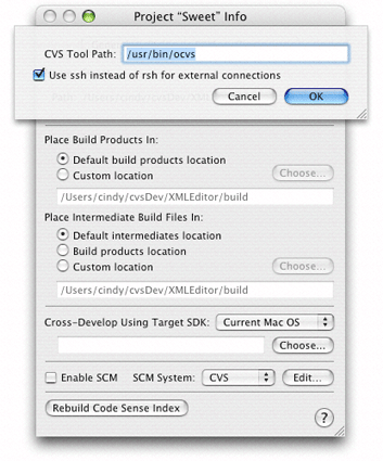 If you use SSH to access a CVS repository, select “Use ssh instead of rsh for external connections” as shown in Figure 21-2. See Accessing a CVS Repository for further details.