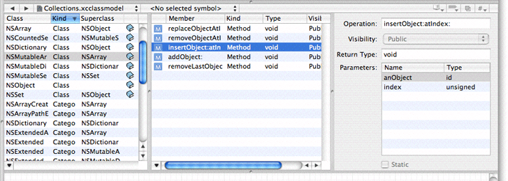 • Rolled up, so that just the name of the class or entity is showing. This gives the most compact representation, with maximum information density in the diagram. (In Figure 10-3 the NSDocument node is rolled up.)