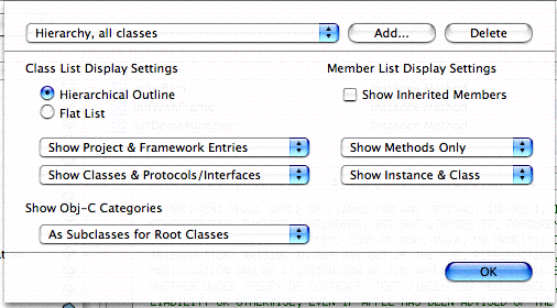 Class browser. Using the class browser, you can view the classes in your project and its included frameworks. From the class browser, you can easily access declarations, source code, and documentation for these classes and their members. The class browser is discussed in the section Viewing Your Class Hierarchy.