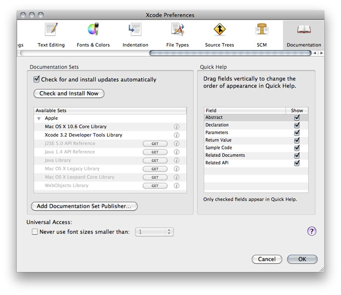The Documentation preferences pane (shown in Figure 6-4) provides options for managing your documentation sets, customizing Quick Help, and setting the minimum font size used in the Documentation window.