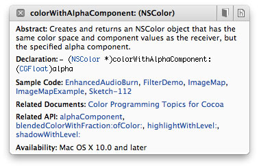 Figure 6-1 shows Quick Help with information for the colorWithAlphaComponent: method of the NSColor class.