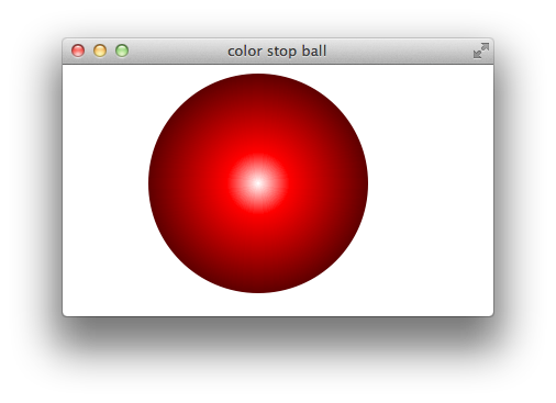 By default, the rate of color change is constant, dividing the gradient into equal-size color blends. Modify this behavior by providing color stops that specify the distance from the gradient center to its edge for particular colors. For example, the following snippet creates a gradient that blends from white to red in just 20% of the gradient, then takes the remaining 80% to fade to black, as Figure 1-12 illustrates: