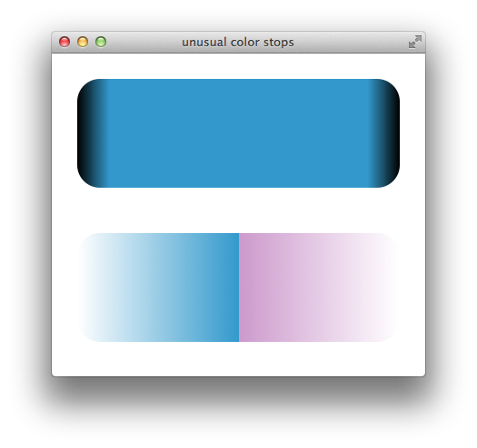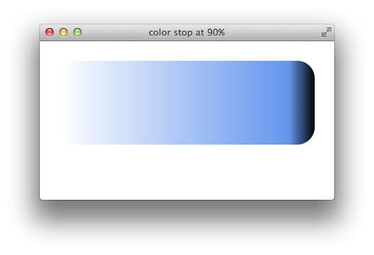 By default, the rate of color change for a gradient remains constant; if the gradient has three colors, the blend starts with the first color at 0% of the gradient length, reaches the second color at 50% of the gradient length, and reaches the third color at 100% of the gradient length. In other words, the first line of the gradient is the starting color, the middle line is the second color, and the last line is the third color. To modify this behavior, specify color stops. For example, the following snippet creates a gradient that changes gradually from white to cornflower blue over 90% of the gradient length and then blends quickly from to black over the remaining 10%: