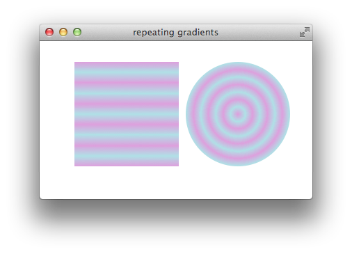You can create a repeating pattern in a gradient in two different ways. One way is to specify a series of repeating color stops. For example, the following snippet creates linear and radial gradients with two repeating red-to-blue-to-red blend stripes: