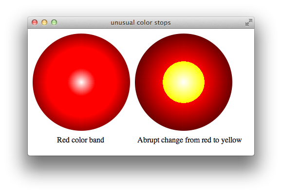 Specify paired color stops of the same color to create bands of solid color, or specify pairs of color stops with different colors at the same percentage point to create abrupt color changes. The following snippet defines two radial gradients, one with two color stops of the same color and the other with two differently colored stops at the same percentage point. Figure 1-13 shows the result: