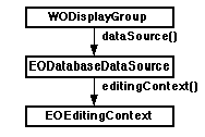 Typically a WODisplayGroup has an EODatabaseDataSource, which in turn, has an EOEditingContext. The EODatabaseDataSource maintains a fetch specification and an array of objects obtained from the EOEditingContext. Figure 1 shows the relationship between the WODisplayGroup, its EODatabaseDataSource and the session's EOEditingContext.