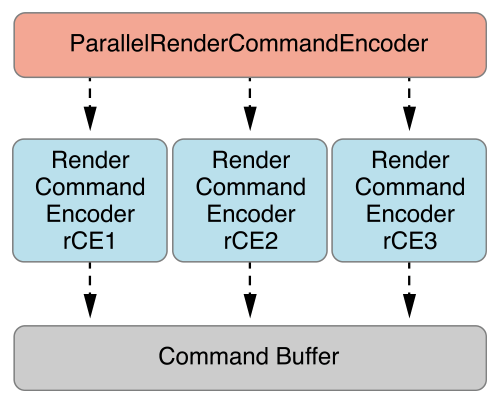 A MTLRenderCommandEncoder object represents a single rendering command encoder. A MTLParallelRenderCommandEncoder object enables a single rendering pass to be broken into a number of separate MTLRenderCommandEncoder objects, each of which may be assigned to a different thread. The commands from the different render command encoders are then chained together and executed in a consistent, predictable order, as described in Multiple Threads for a Rendering Pass.