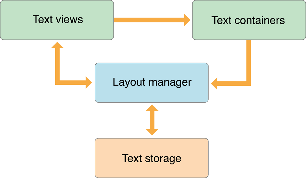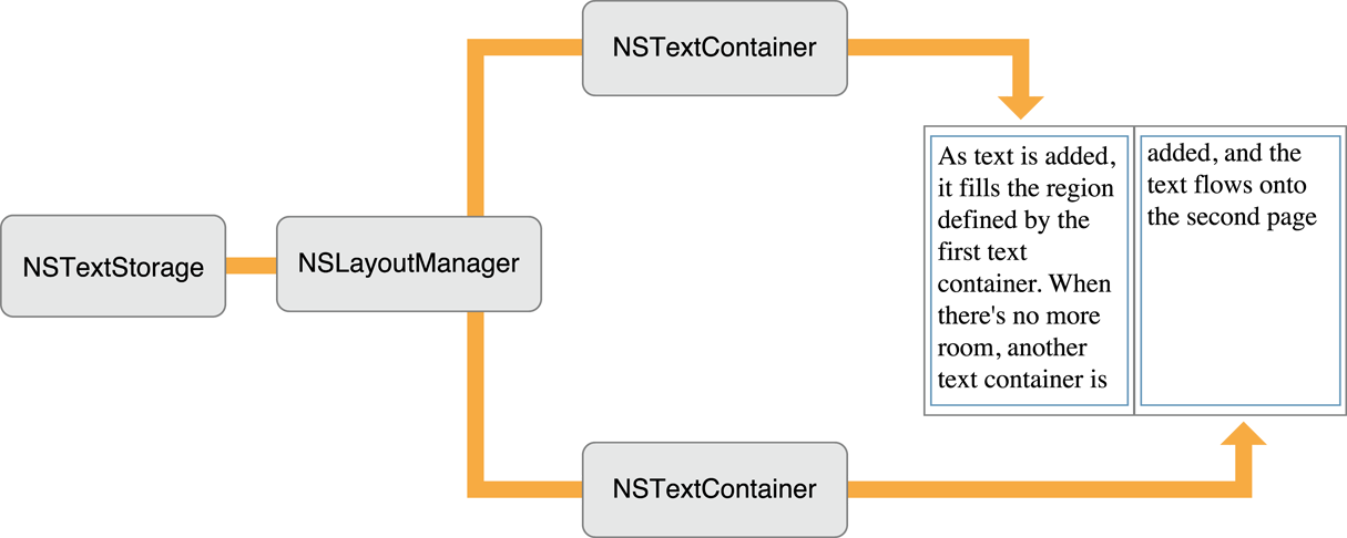 The data flow paths among the primary Text Kit objects are shown in Figure 8-2. Text views are instances of UITextView class, text containers are instances of NSTextContainer class, the layout manager is an instance of NSLayoutManager class, and the text storage is an instance of NSTextStorage class. In Text Kit, an NSTextStorage object stores the text that is displayed by a UITextView object and laid out by an NSLayoutManager object into an area defined by NSTextContainer object.